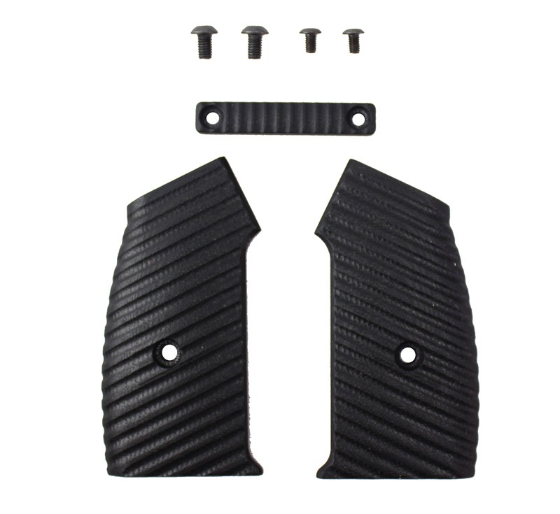 別売のCNCアルミモジュラーピストルグリップ(型番:GB-152)に対応したアルミ製グリップカバーです。 斜めに入ったテクスチャが特徴的となっています。