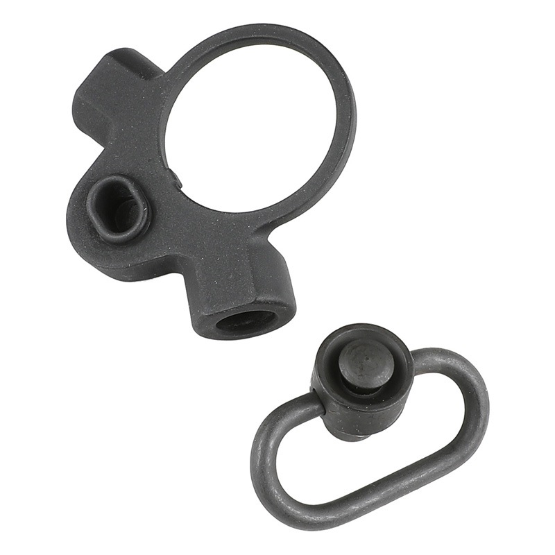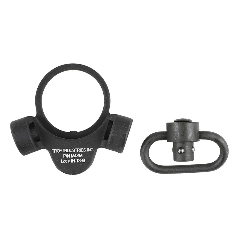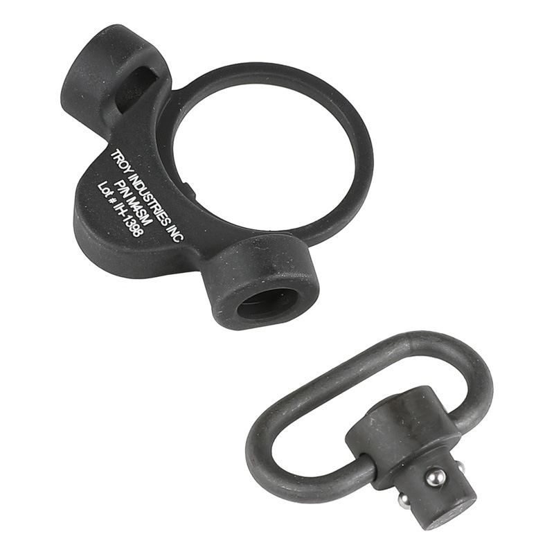 M4 GBBのストックチューブに対応したTroy OEMスタイルデュアルスリングマウントです。 オリジナルパーツのエンドプレートと交換することで、アンビタイプのQDスリングマウントを取り付けることができます。 プッシュボタン式QDスリングスイベルが付属するため、利き手や用途、射撃スタイルなどに応じて容易に付け替えることが可能です。