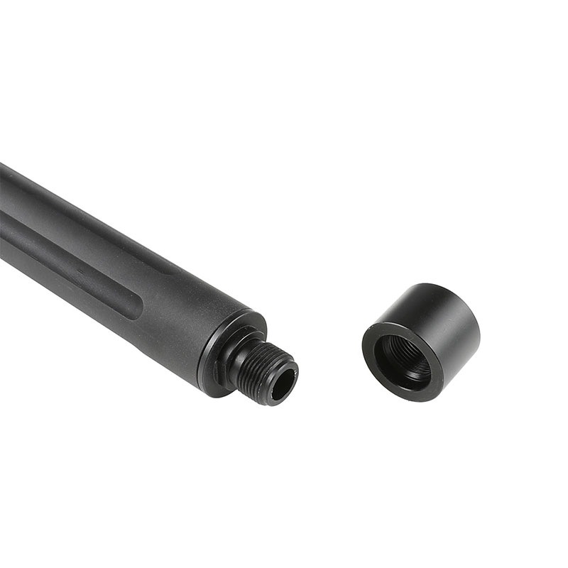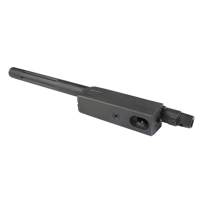 ホークアイから流用するパーツは機関部/マガジンとなっており、インナーバレルは内径:6.04mm/全長:364mmが付属します。 アウターバレルはツイストフルートタイプ、マズルのネジ規格は14mm逆ネジのため、マズルブレーキ、コンペンセイター、サイレンサーなど様々なマズルアタッチメントが装着可能となっています。 ※画像のアウターバレルのカラーはブラックですが、実際はダークグリーンの光沢がありますのでご注意ください。