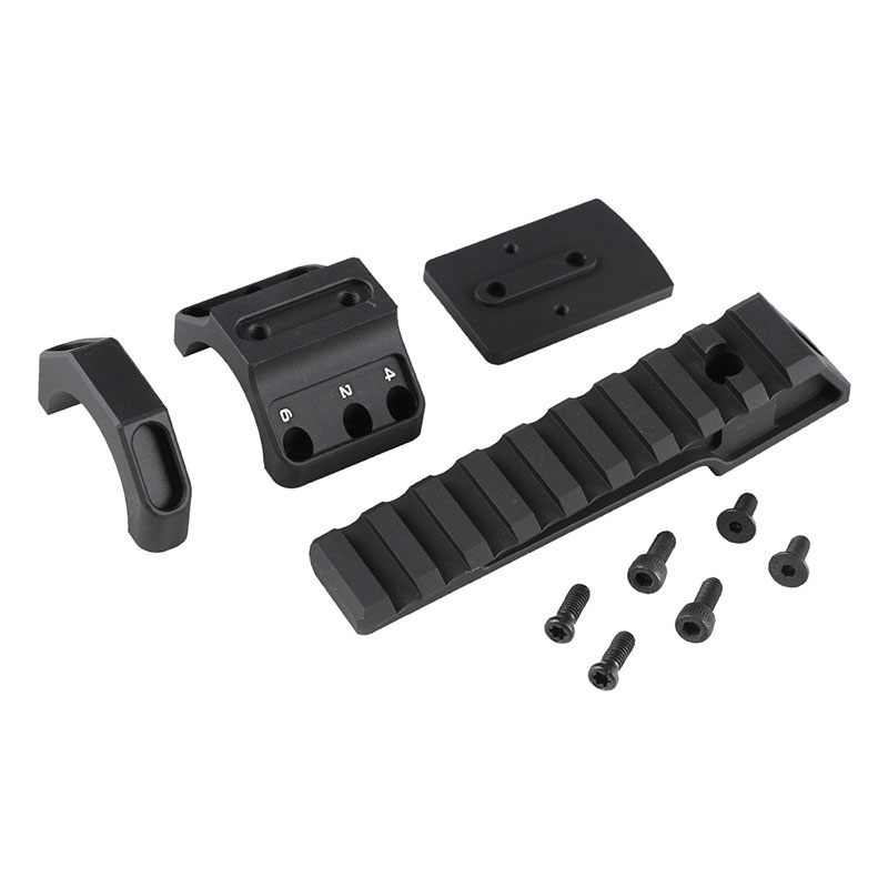 バックアップ用ドットサイトやPEQなどのエイミングデバイスをマウントすることが可能です。 また、RMRドットサイト用のダイレクトマウントも付属します。