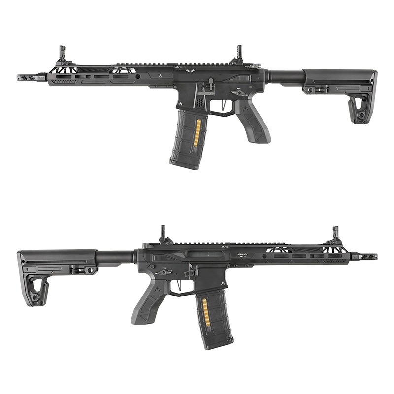通常電動ガンの2倍の速度で駆動するDSG(デュアルセクターギア)を搭載し、標準装備のEshooter kestrel V2電子トリガーの機能と性能を生かした組み合わせです。 プリコック・トリガー感度調整をお好みに合わせて行えば更に戦闘力アップします。 アジャスタブルトリガーをワンオフ加工にて装備しています、引き遊びとフォロースルー(発射後の遊び・後ろ遊び)を独立して調整できます。 ブラシレスモーター(34K)は振動やブレが少なく精密な射撃と俊敏なトリガー操作とレスポンスを実現しています。 素早い反応・キレのある射撃フィーリングに対応した現代のサバゲシーンにマッチさせた仕様です。 DSGの特性上遠距離射撃は苦手ですが、20~30m程度の近接戦闘に威力を発揮します。