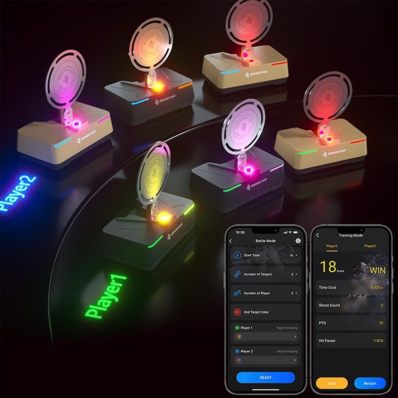 反応速度、射撃精度を重視し、お手持ちのスマートフォン・タブレット端末とのBluetooth接続でトレーニングモードや対戦モードを設定可能となっており、エキサイティングなシューティング体験をさせてくれる最新・最高レベルのスペックを搭載した電子ターゲットです。