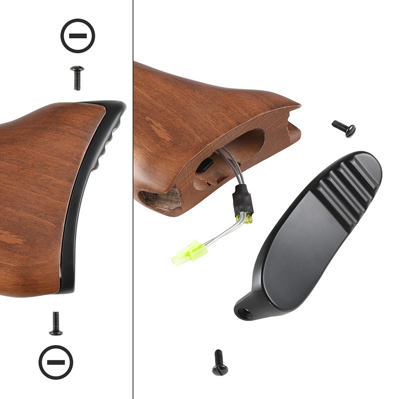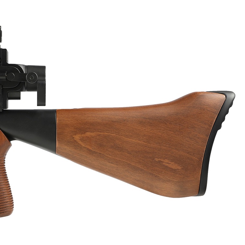 ピストルグリップ、ストック、キャリングハンドルにはリアルウッドを採用。 使用された時代を彷彿とさせる樹脂製と一味違った質感で仕上げられています。