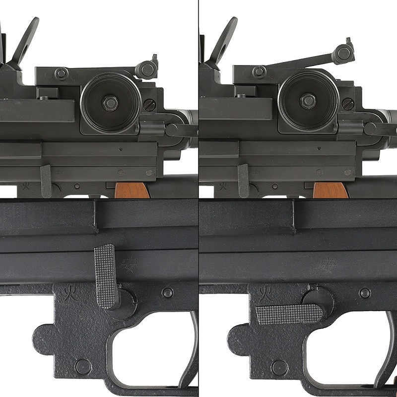 蛇腹状に放熱加工が施された大型のバレル、レシーバー上部にマガジンを装着する特異な方式などもリアルに再現しています。