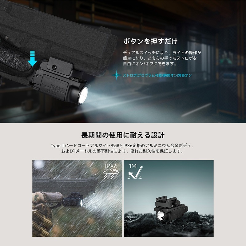 PL-mini 3は左右双スイッチのテールスイッチを採用しており、左利きか右利きかフラシュライトを快適に操作できます。