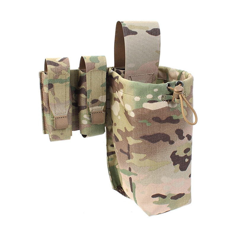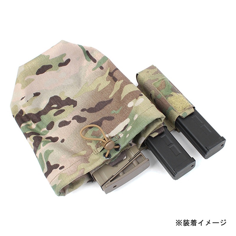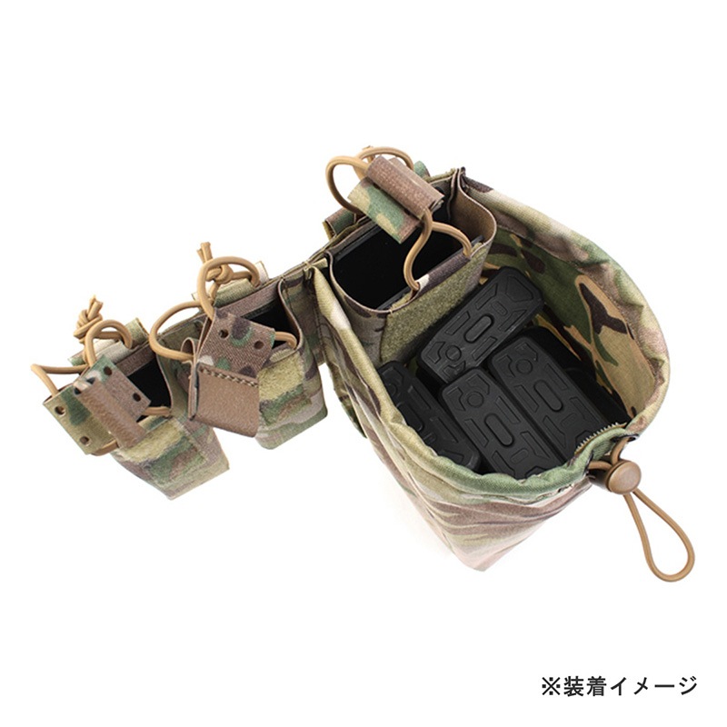 5.56mmライフルマガジン1本と9mmダブルスタックピストルマガジン2本を収納可能なポーチに、ダンプポーチを一体化した多機能ベルト装備です。