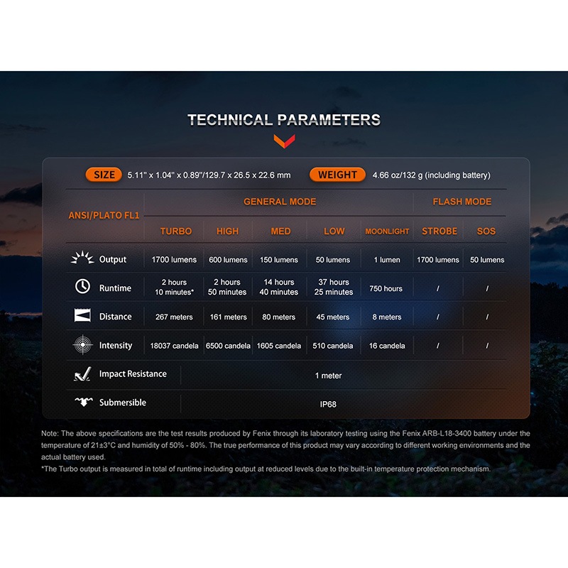 ・使用電池:Fenix ARB-L18-3400(18650リチウムイオン電池/3400mAh)1本(付属)