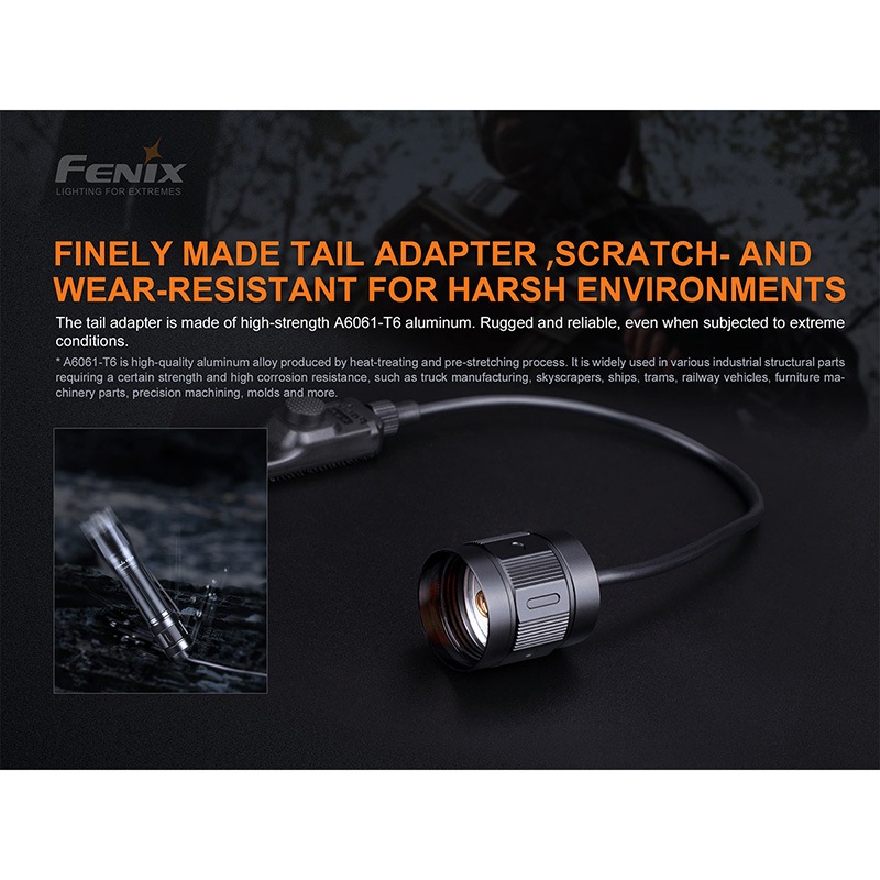 Fenix AER-05は、APF回路搭載の21700バッテリー対応タクティカルフラッシュライト専用に設計されたリモートプレッシャースイッチです。スイッチ部には静音テープスイッチとラウンド形状のタクティカルスイッチを搭載し、モーメンタリー点灯・常時点灯の両方を瞬時に操作可能。A6061-T6アルミ合金製テールアダプターは、表面に耐摩耗性に優れたハードアナダイズド仕上げ(タイプIII)を施し、過酷な環境でも高い信頼性を発揮します。