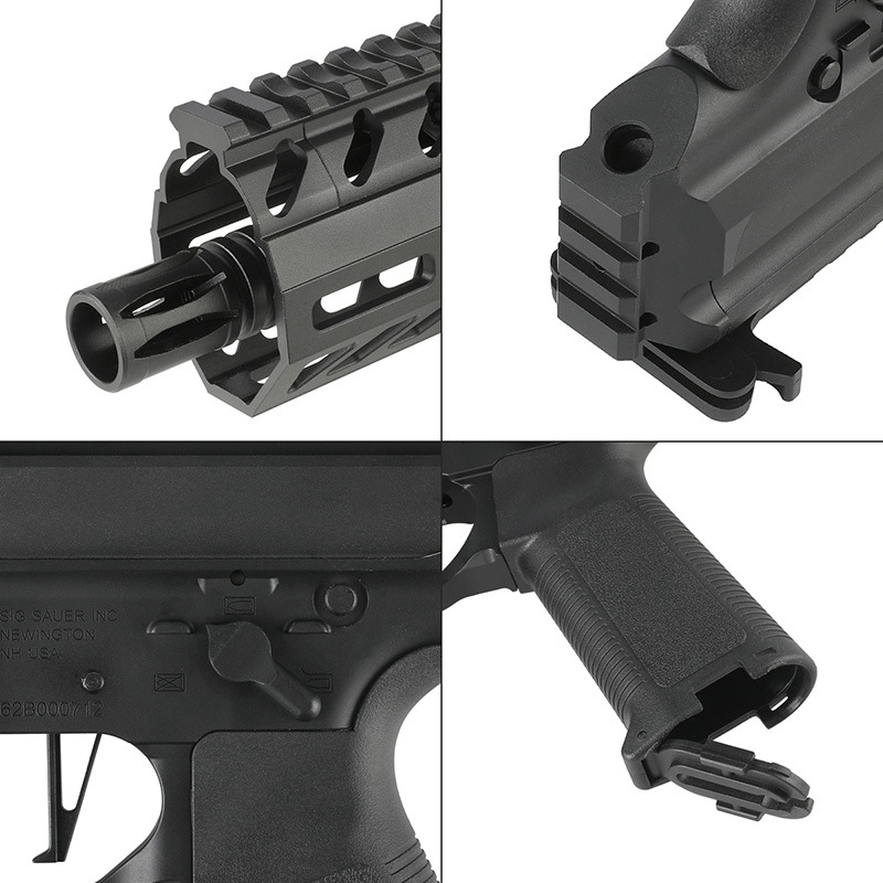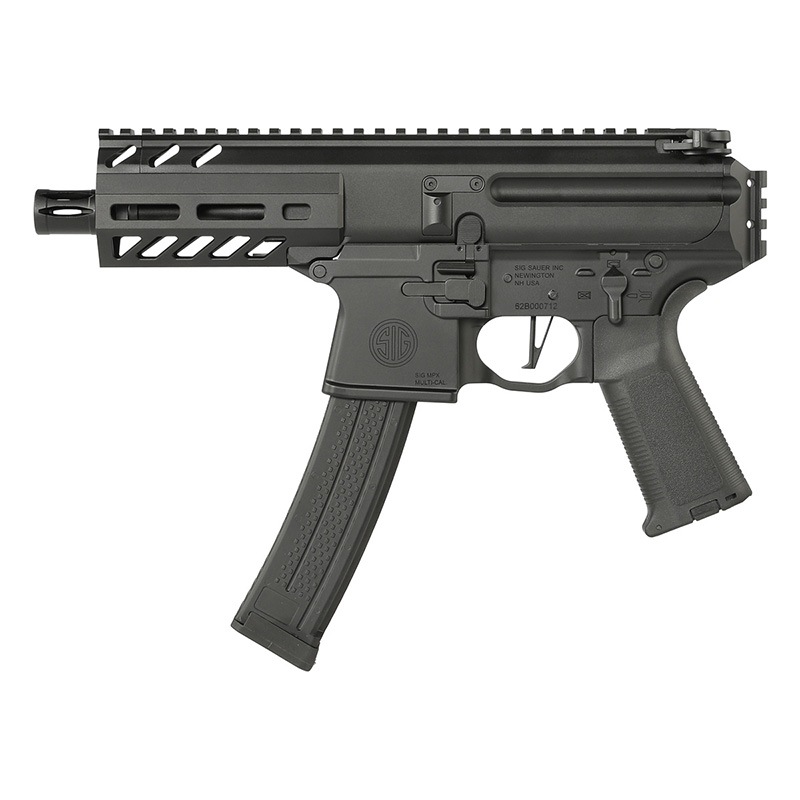 SIG MPX K は、SIG社が展開するMPXシリーズの中でも最もコンパクトなモデルで、近接戦闘(CQB)や携行性を重視するユーザー向けに設計された9mmピストルキャリバーカービン(PCC)です。バレル長は約4.5インチと短く、全長も約21インチ前後と極めてコンパクトながら、ARスタイルの操作性と高いモジュール性を維持しており、折りたたみ式ブレースの装備や各種M-LOK/ピカティニーパーツの装着にも対応しています。