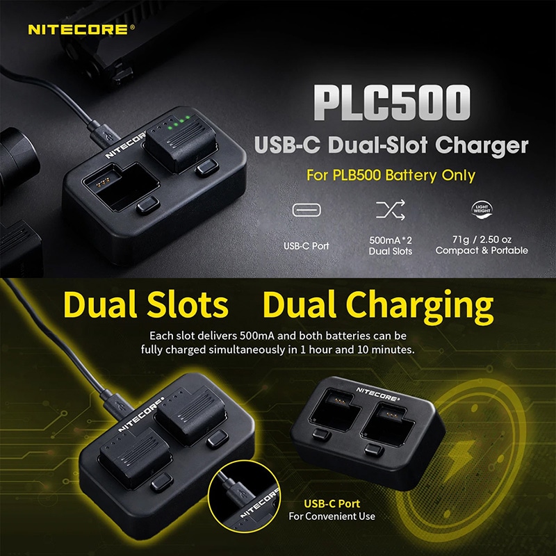 NITECORE製PLC500は、PLB500専用に設計されたUSB-C対応のデュアルスロット充電器。各スロット500mAの安定出力で、2本同時充電にも対応。コンパクトかつ堅牢な筐体により、日常携行から現場用途まで幅広く対応します。