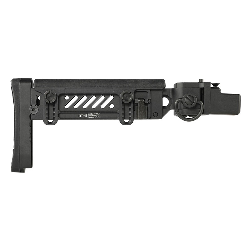 Zenit PT-5は、AKシリーズの操作性向上と携行性を目的として設計された金属製フォールディングストックで、高い剛性と実用性を両立したデザインが特徴です。堅牢なヒンジ構造と多段階調整機構により、使用者の体格や装備に合わせた柔軟なセッティングが可能となっています。本製品は、その外観的特徴と構造コンセプトをエアソフト用に落とし込んだレプリカモデルです。