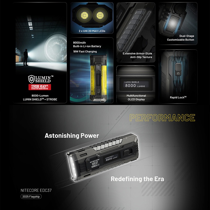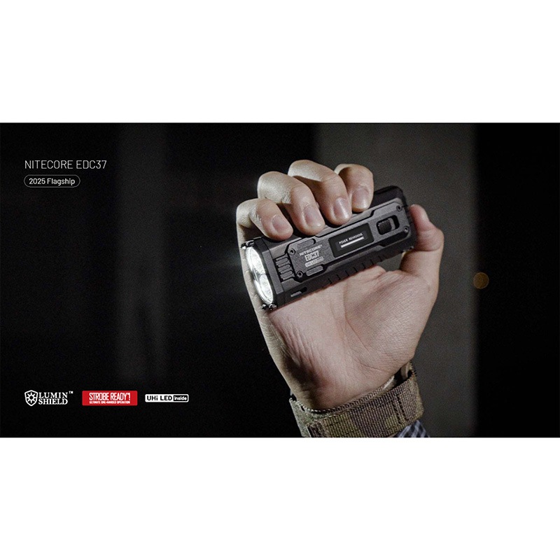 NITECORE製EDC37は、携帯性と圧倒的な照射性能を高次元で融合したタクティカルEDCフラッシュライトです。2基のNiteLab UHi 20 MAX LEDを搭載し、LUMIN SHIELD™モードでは最大8000ルーメンの超高出力を瞬時に発揮。SEARCHモードでは最大420mの長距離照射に対応し、状況に応じた精密な照射制御を可能にします。内蔵8000mAhリチウムイオンバッテリーとUSB-C急速充電、リアルタイム表示が可能な多機能OLEDディスプレイ、Rapid Lock™ロックアウト機構、レベルプリセット機能など、実戦的な操作性と安全性を徹底追求。EDCの枠を超え、プロフェッショナルユースにも応えるハイエンドモデルです。