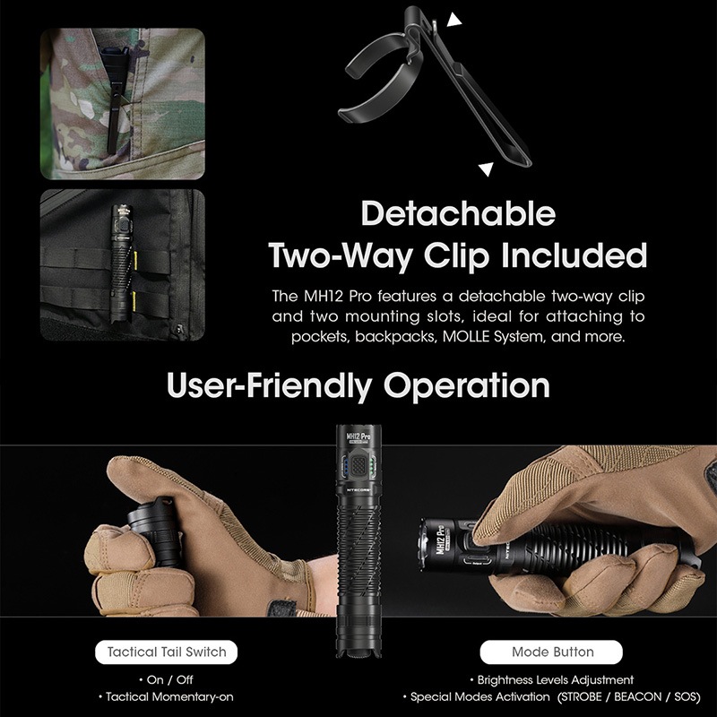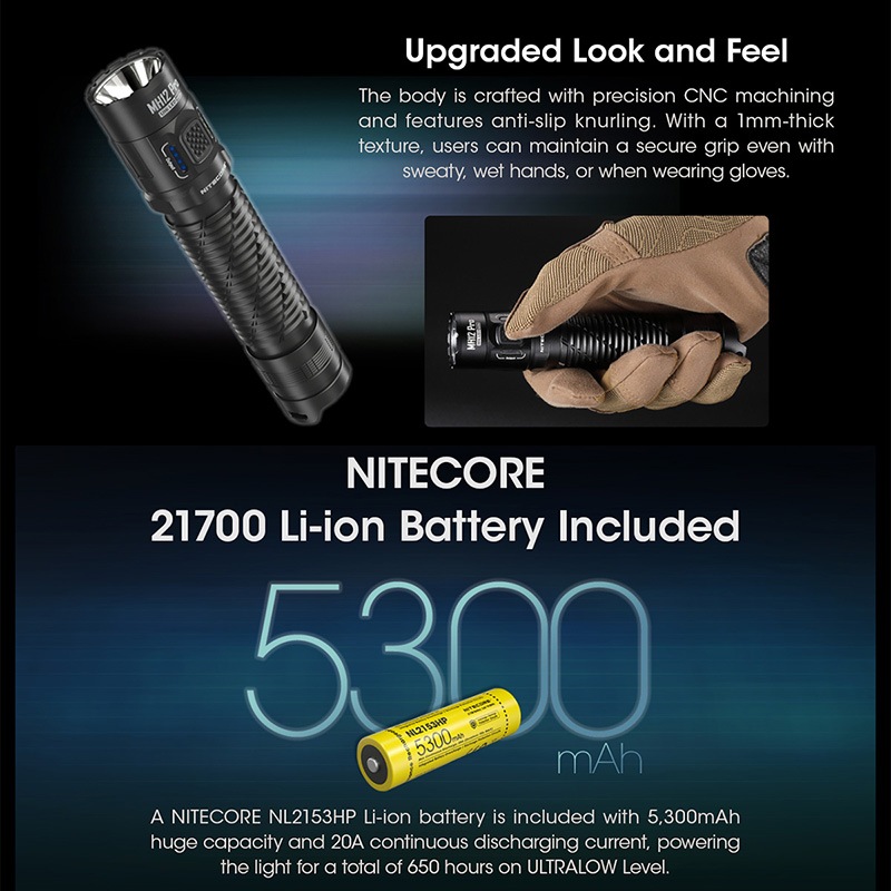 NITECORE製MH12 Proは、日常携行(EDC)からアウトドア、タクティカル用途まで幅広く対応する高性能フラッシュライト。UHi 40 LEDを搭載し、最大3300ルーメンの高出力と最大505メートルの長距離照射を実現。テールのタクティカルスイッチと側面モードボタンによる直感的な操作系に加え、デイリーモード/タクティカルモードの切替にも対応する。21700リチウムイオン電池(5300mAh)を標準付属し、USB Type-Cによる本体充電が可能。IP68防塵防水、ATR温度制御、近接センサー保護機能など、安全性と実用性を高次元で両立したモデル。