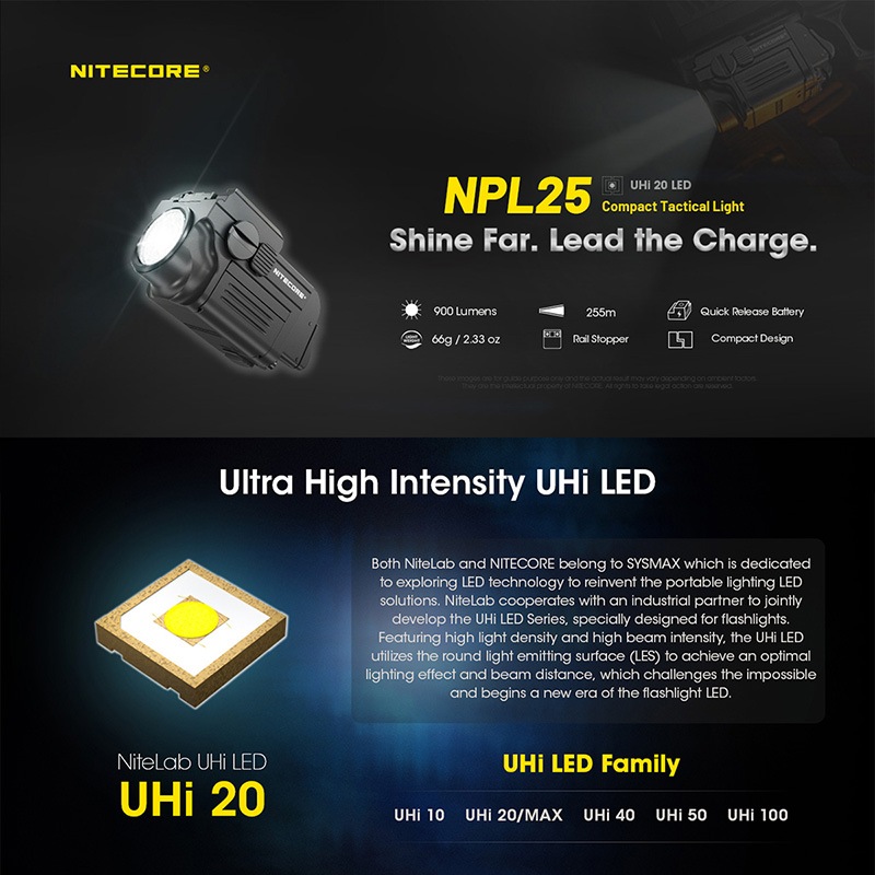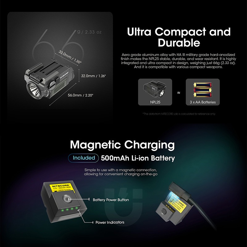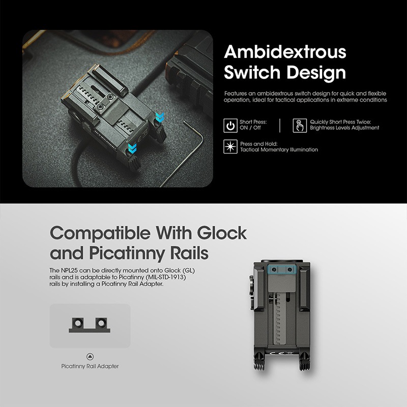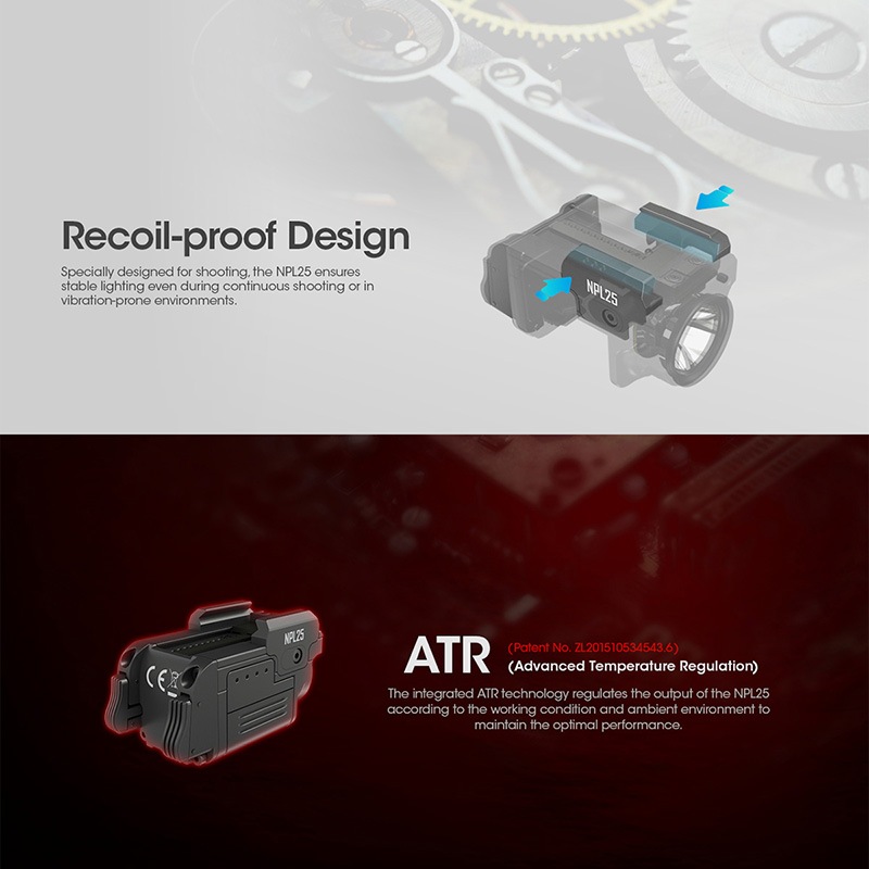 NITECORE製NPL25は、UHi 20 LEDを搭載したコンパクトタクティカルライトです。最大900ルーメンの高出力と255mの照射距離を実現しながら、Glockのアンダーレールやピカティニーレールに対応する超小型設計を採用。アンビデクストラス(左右両対応)スイッチ、耐反動構造、ATR(温度制御)を備え、ハンドガン搭載時でも安定したパフォーマンスを発揮します。